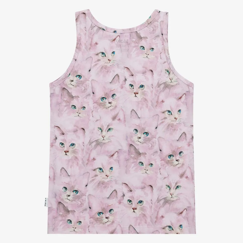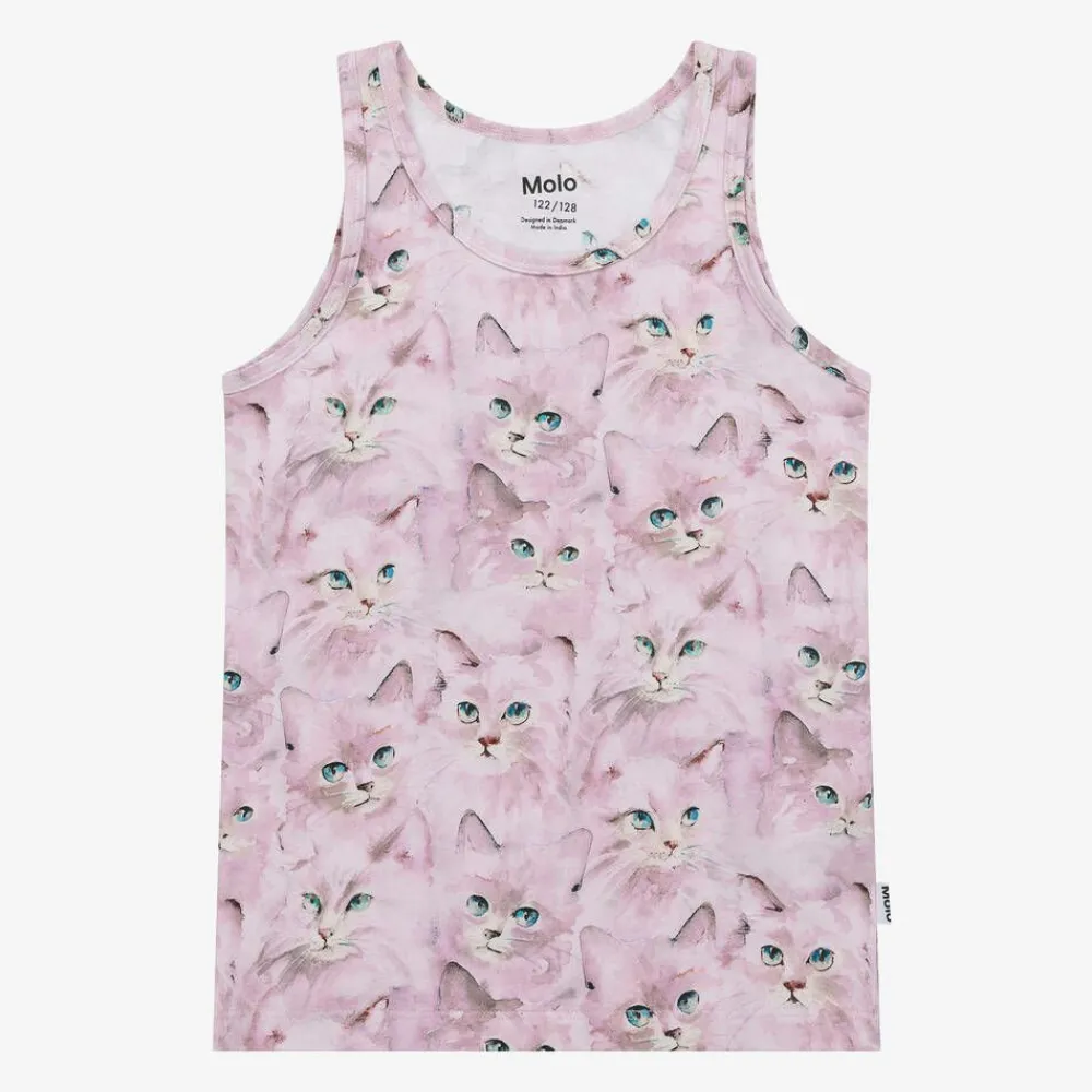 In a useful pack of two, these sleeveless vests for girls by Molo are made from soft organic cotton jersey. One top is in a plain lavender pink shade and the other is patterned with cute watercolour kittens. Both pieces have a logo tab on the side seam for a branded finish.