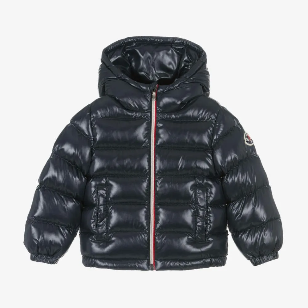 Navy blue puffer jacket for little boys and girls by luxury brand Moncler Enfant, made in shiny laquƩ fabric. Water repellent and breathable, it is warmly padded in soft down for superior comfort and warmth. There are elasticated cuffs to help keep out chilly winds, with a fixed hood and popper-fastening front pockets. The exposed tricolour front zip fastening has a branded puller, and the designer's signature felted badge is visible on one sleeve.