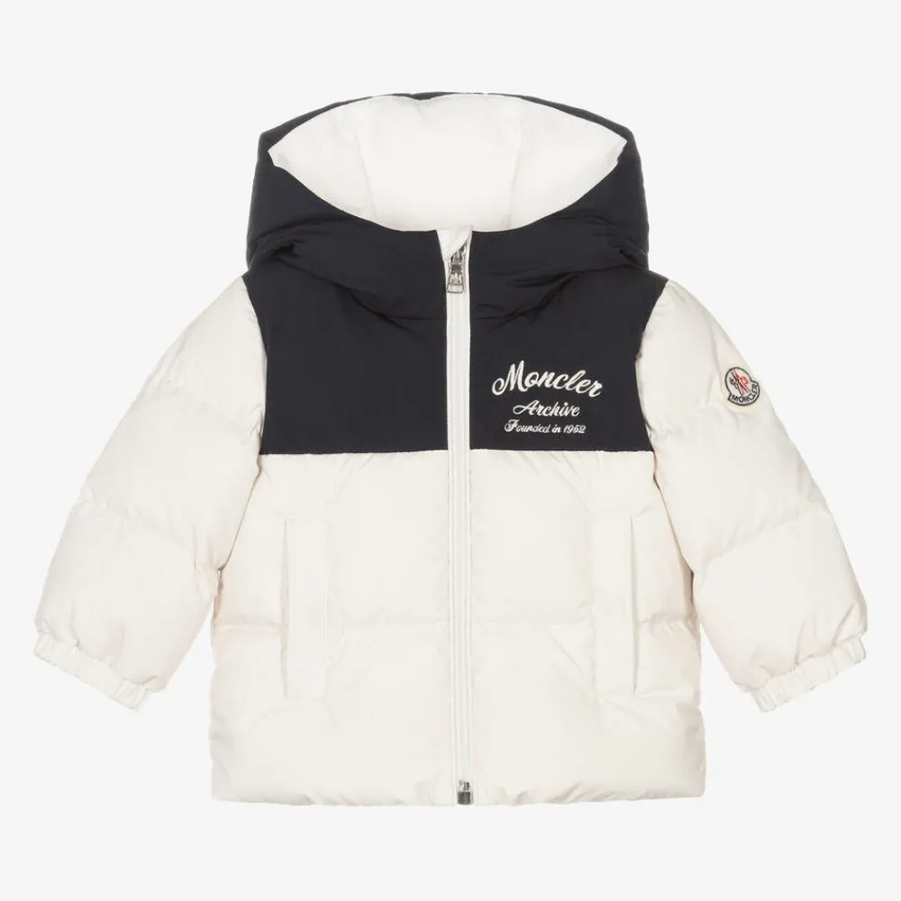 Ivory water-repellent puffer coat for little boys from luxury brand Moncler Enfant. Made in silky, matte fabric and padded with warm down, it has the brand's iconic felt logo patch on one sleeve, a logo-embossed front zip fastening and useful popper fastening side pockets. The cuffs are gently elasticated, and it is fully lined in a soft jersey for extra warmth. The designer's logo is embroidered on the navy blue shoulder panel for instant brand recognition.