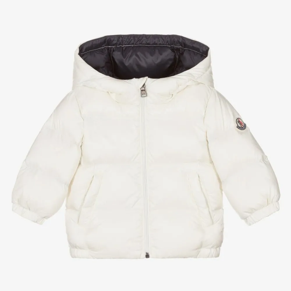 White hooded puffer jacket for little boys by luxury brand Moncler Enfant, with the iconic logo patch on the sleeve. Made and lined in the brand's super lightweight and water-repellent nylon doudoune legere, it is down padded for excellent warmth. Easy to zip up on the front, it also features elasticated cuffs to keep the chills out, a silky navy blue lining and popper fastening front pockets.