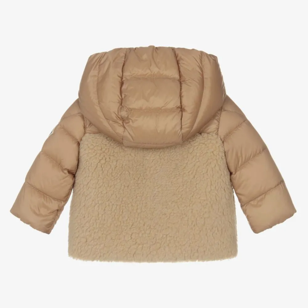 Cute dark beige hooded puffer coat for little boys and girls by luxury brand Moncler Enfant. Padded with lightweight down for superior warmth, the jacket has a silky smooth exterior with beautifully soft teddy fleece panelling. Lined in comfortable cotton jersey, it fastens easily with a branded zip and has popper-fastening pockets. For a signature finish, the designer's instantly recognisable logo patch can be seen on one sleeve.