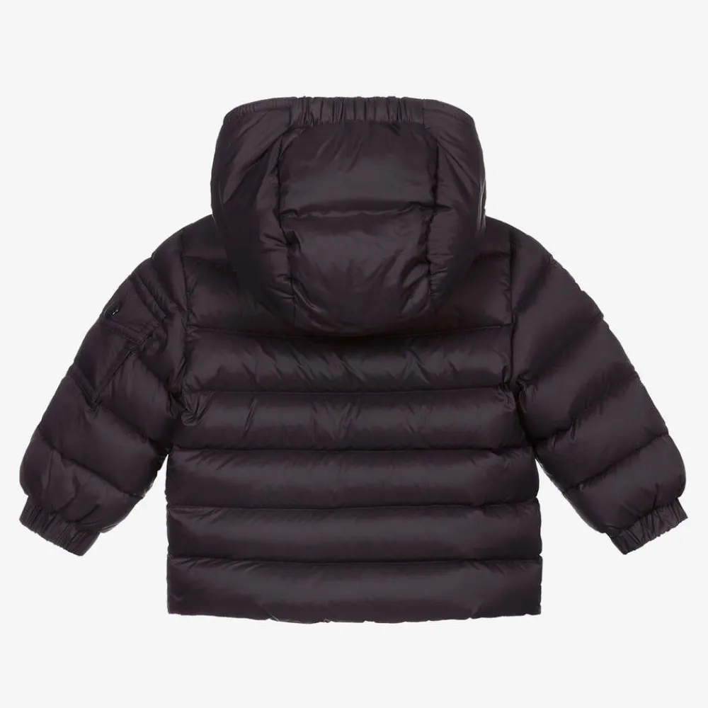 Navy blue puffer jacket for little boys and girls by luxury French brand Moncler Enfant. Water repellent and padded in warm yet lightweight down, it has a removable hood, zipped hand pockets, and a small pocket on one sleeve. Logo-embossed fastenings add a statement finish and the designer's iconic felt logo is instantly recognisable on the chest. The jacket fastens with an exposed zip on the front and the elasticated cuffs help to insulate against chilly winds.