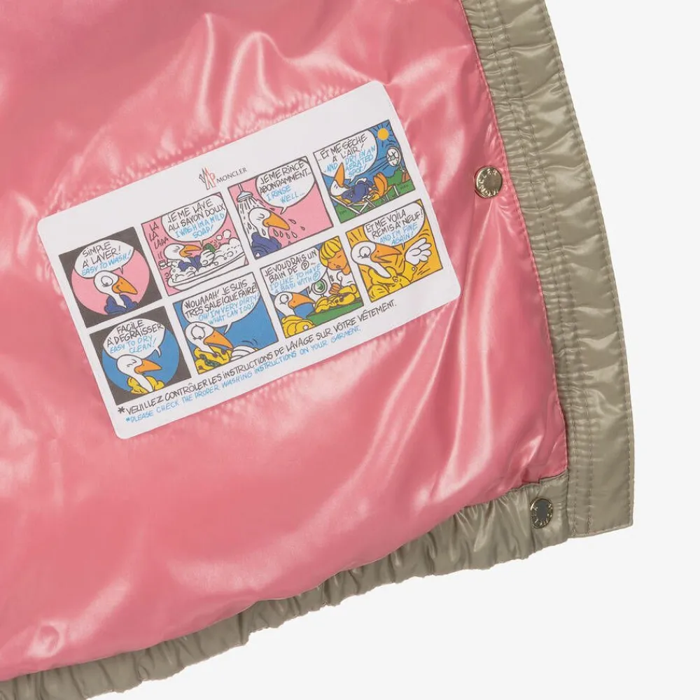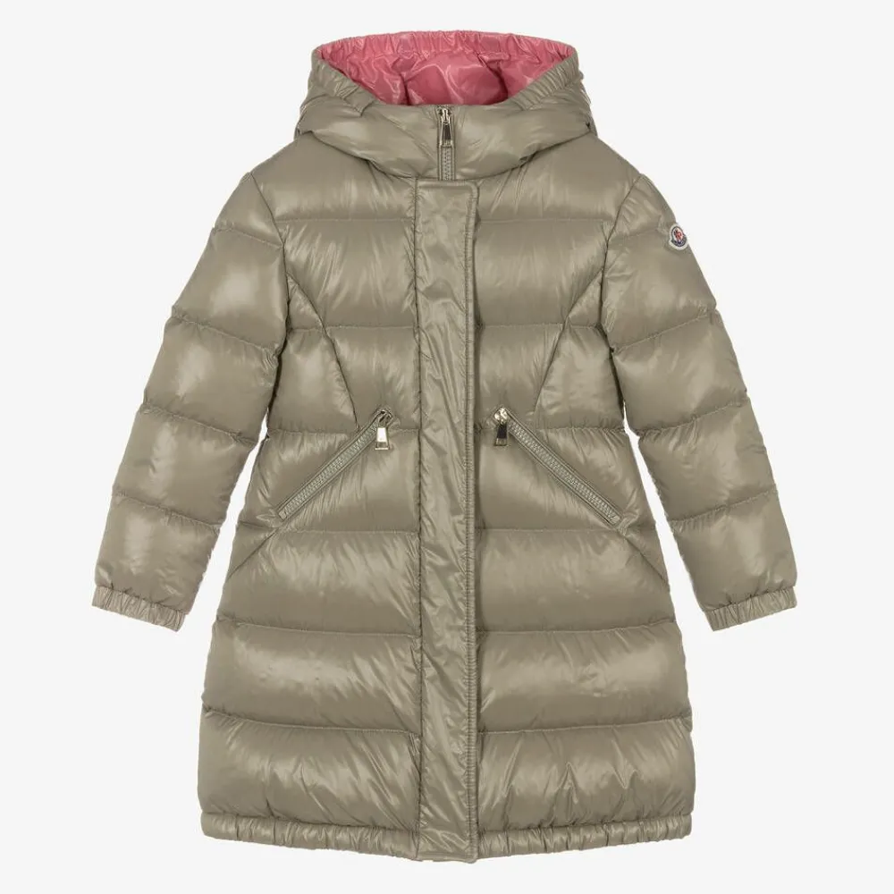 Long and cosy, this khaki beige, Mini-me puffer coat for girls is by luxury brand Moncler Enfant, made in water-repellent, recycled nylon laque. Just right for chilly days, it is padded in warm down, with a fixed, padded hood. It has gently elasticated cuffs and an elasticated hemline to keep the chills out, with a popper-fastening flap over the front zip for extra protection. There are useful, zipped front pockets and a silky pink lining for comfort.