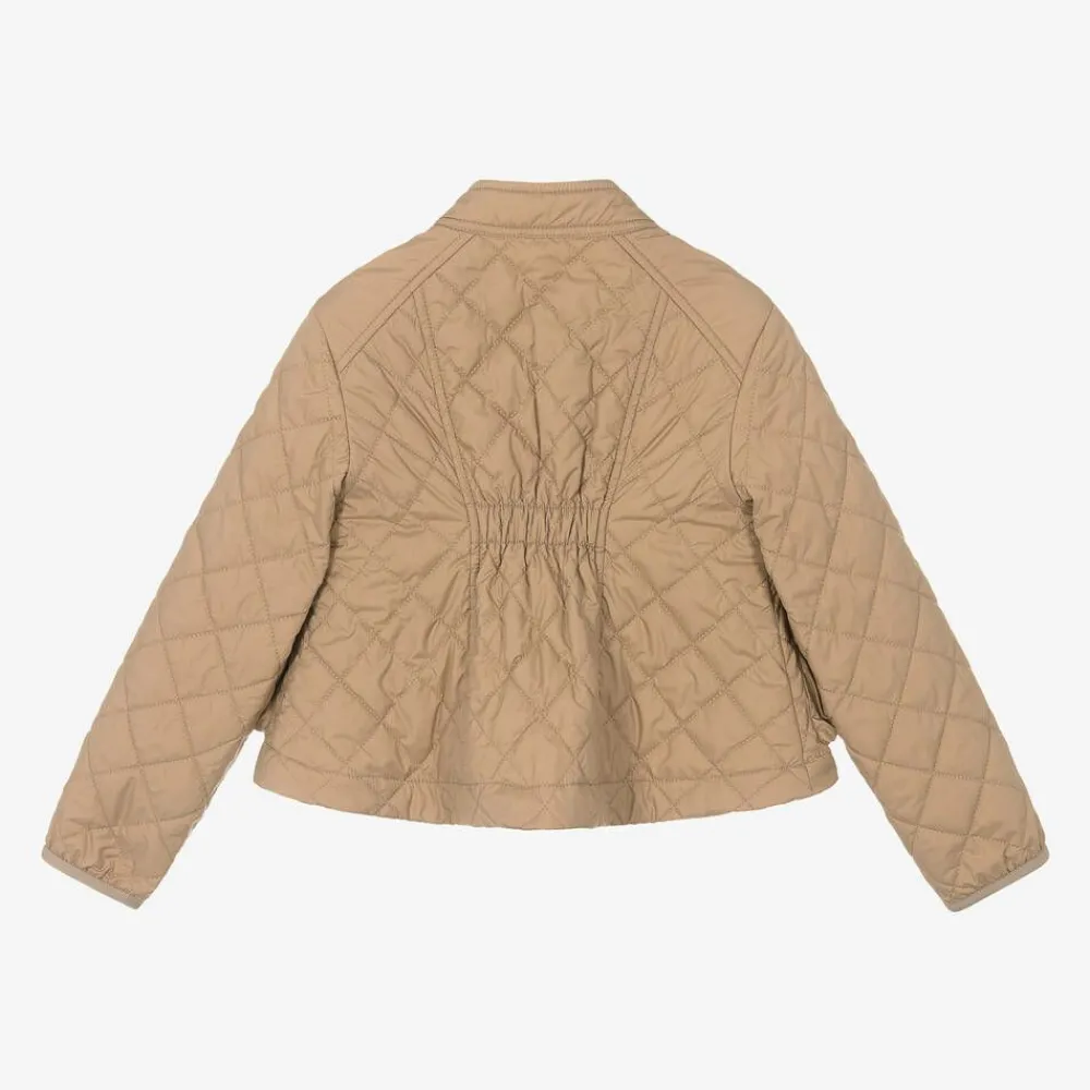 A beige quilted jacket for girls by luxury brand Moncler Enfant. Soft and smooth with a silky lining, this stylish jacket has lightweight padding for extra comfort. It fastens with a concealed zip and shiny gold branded poppers and has large flap pockets on the front, useful for carrying small essentials. Designed with an elasticated panel on the back for a fitted look, it is stitched with an iconic ivory felt logo patch on one long sleeve.