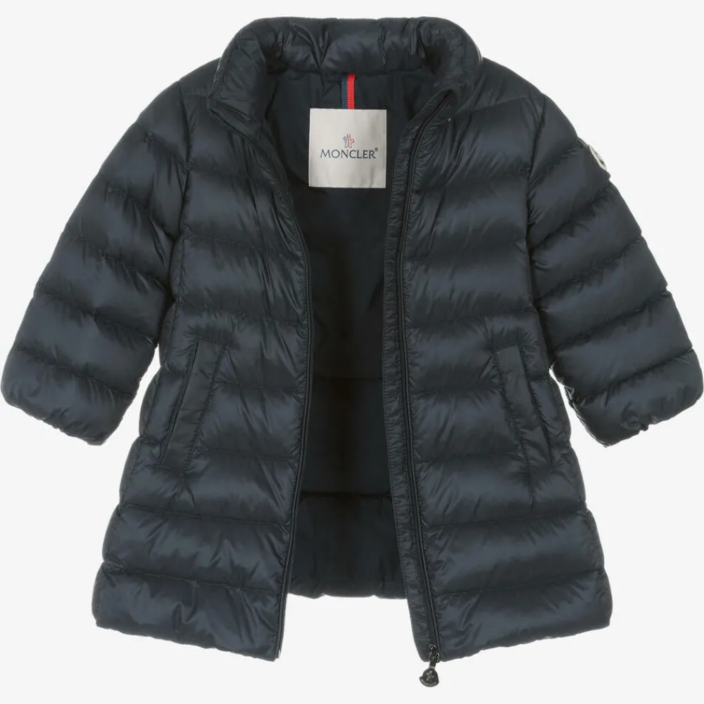 Stylish navy blue puffer coat for little girls by Moncler Enfant, padded with luxuriously warm down. In a gorgeous flared shape, this water repellent coat has popper-fastening hand pockets on the front and an easy-to-use front zip fastening. The instantly recognisable felt logo badge is stitched on one sleeve for a branded look. The cuffs have elasticated trims to keep out cold chills, and the hood is detachable for versatile wear.