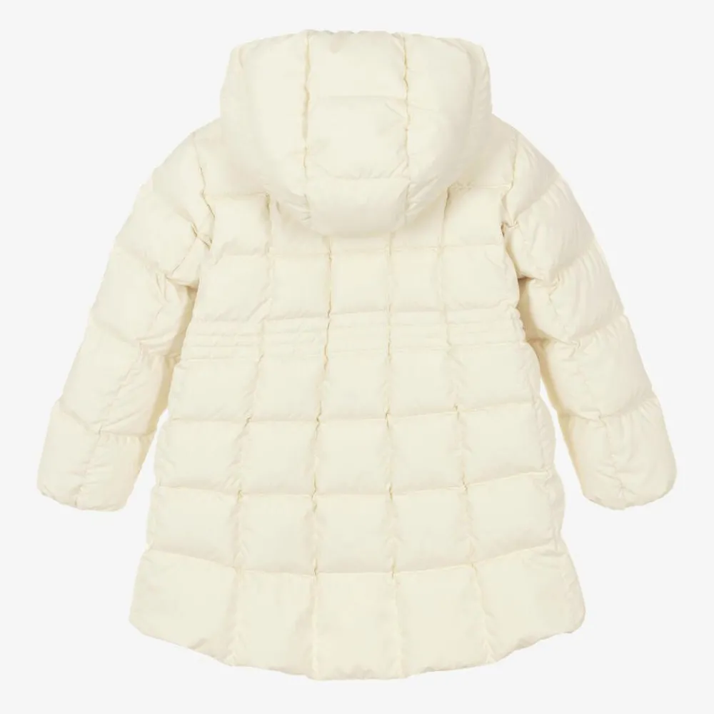 Long ivory parka-style puffer coat for girls by luxury brand Moncler Enfant, padded with warm down. Made in silky, matt, recycled fabric, this water-repellent coat has a cosy, fixed hood, an elasticated waist for shape and a dipped hem at the back. On the front are useful pockets secured with poppers and an exposed zip fastening. The designer's signature logo badge is sewn on one sleeve, and the cuffs are gently elasticated. The coat is lined in soft satin for comfort.