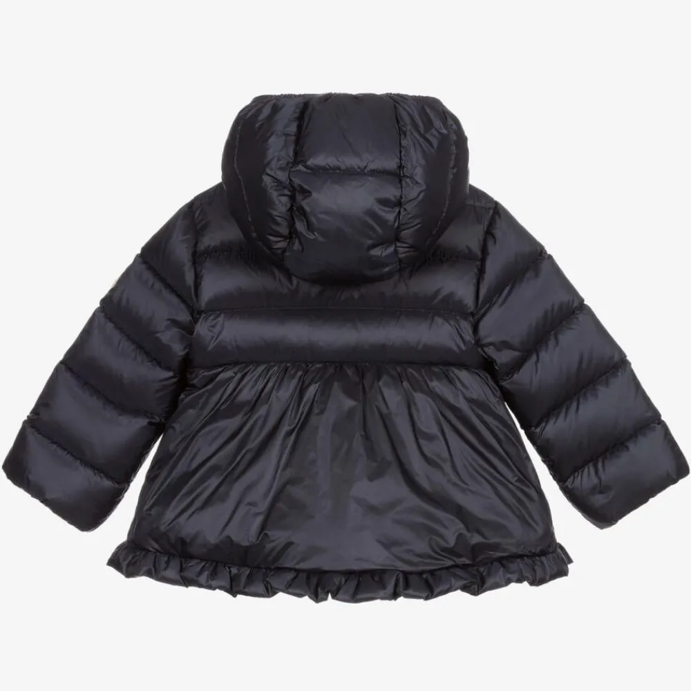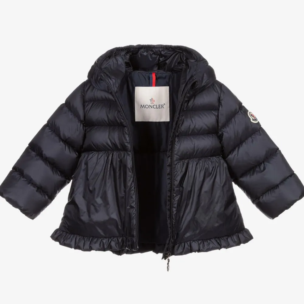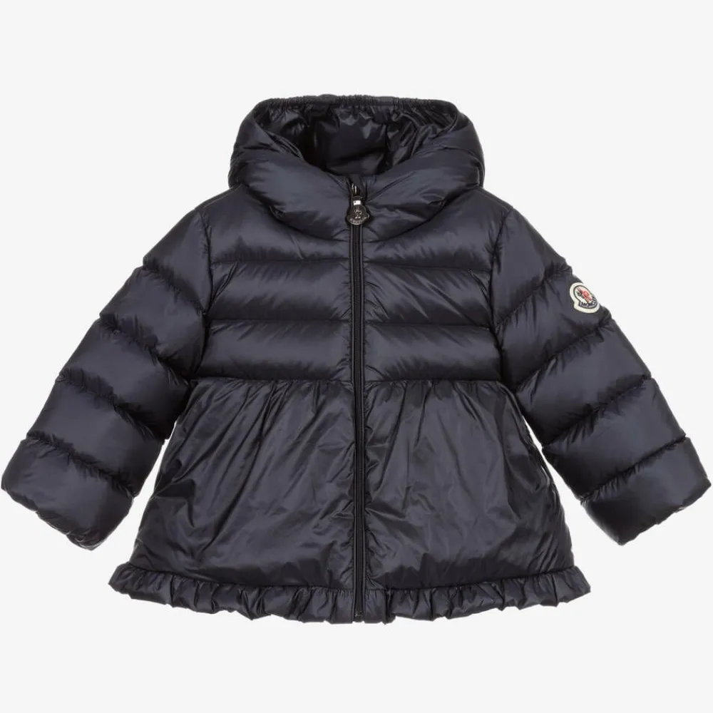 A navy blue puffer jacket for little girls by Moncler Enfant, in a silky smooth water-repellent fabric. It has the signature logo badge on one sleeve, a flared A-line skirt and a ruffled hem for a sweet designer look. This zip-up layer has a luxurious down padding and gently elasticated hood and cuffs.