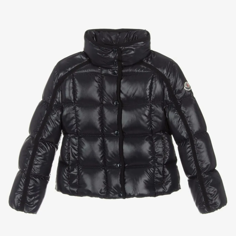 Navy blue puffer jacket for girls by Moncler Enfant, in smooth, recycled nylon laquƩ that is water-repellent for practical wear. Renowned for its warm outerwear, the luxury designer has styled this jacket with square-shaped puffer panels filled with cosy down padding. With a slightly flared silhouette, it has grosgrain trims for interesting texture, a stand-up collar, and the famous logo patch on one sleeve. The front zip has a popper-closing placket for added protection from the elements, with engraved branding for extra designer appeal. The jacket has side pockets with poppers to help keep belongings safe.