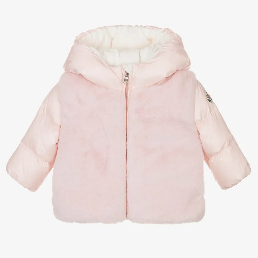 Gorgeous pink hooded puffer jacket for little girls from luxury brand Moncler Enfant. Warmly padded with down, it is made in the brand's signature water repellent, recycled longue saison fabric, with a beautifully soft faux fur front and a comfortable jersey lining. It fastens easily with a branded zip and has concealed popper-fastening pockets. For a signature finish, the designer's instantly recognisable logo patch can be seen on one sleeve.