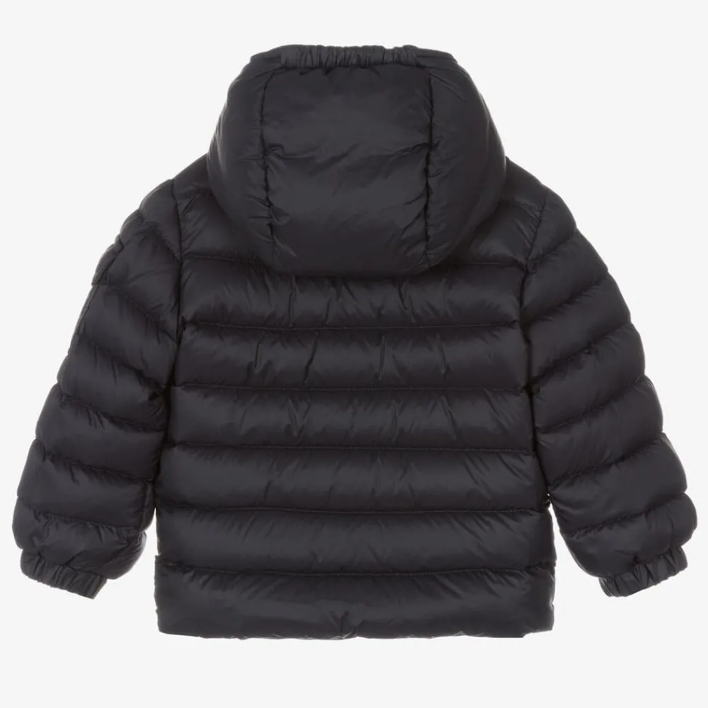 Navy blue puffer jacket for little boys and girls from luxury brand, Moncler Enfant. Silky smooth with a matt water-repellent finish, it is down-padded for excellent warmth without the weight. This zip-fastening jacket is designed with a high collar, a detachable hood that fastens with poppers, and elasticated cuffs. There are zip-fastening front pockets and a patch pocket with a popper on one sleeve. For an iconic Moncler look, the felted logo patch can be seen on the chest.