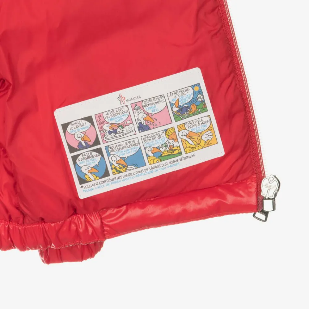 Red puffer jacket for little boys and girls by luxury brand Moncler Enfant, made in shiny laquƩ fabric. Water repellent and breathable, it is warmly padded in soft down for superior comfort and warmth. There are elasticated cuffs to help keep out chilly winds, with a fixed hood and popper-fastening front pockets. The exposed tricolour front zip fastening has a branded puller, and the designer's signature felted badge is visible on one sleeve.
