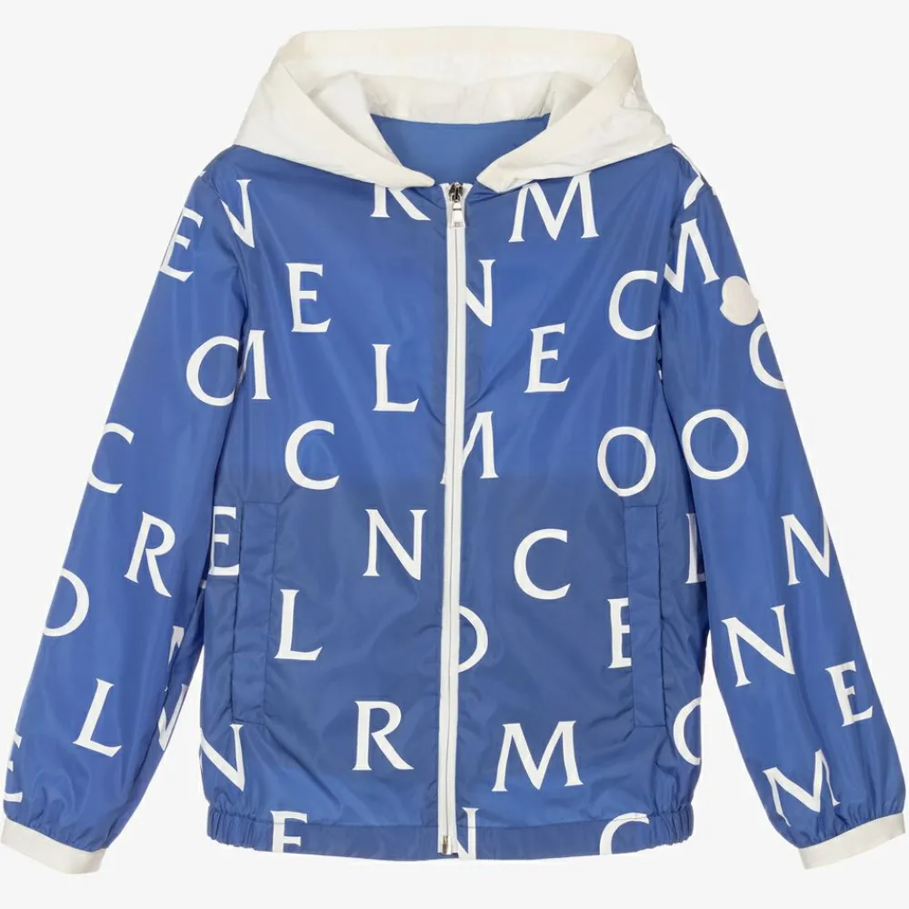 Teen boys mid-blue zip-up windbreaker jacket by luxury brand Moncler Enfant. Smooth and lightweight, it has a white logo-letter pattern and a white silicone logo patch on one sleeve. The ivory hood is lined for comfort and has soft elasticated trim to match the sleeve cuffs. There are popper fastening pockets on the front.