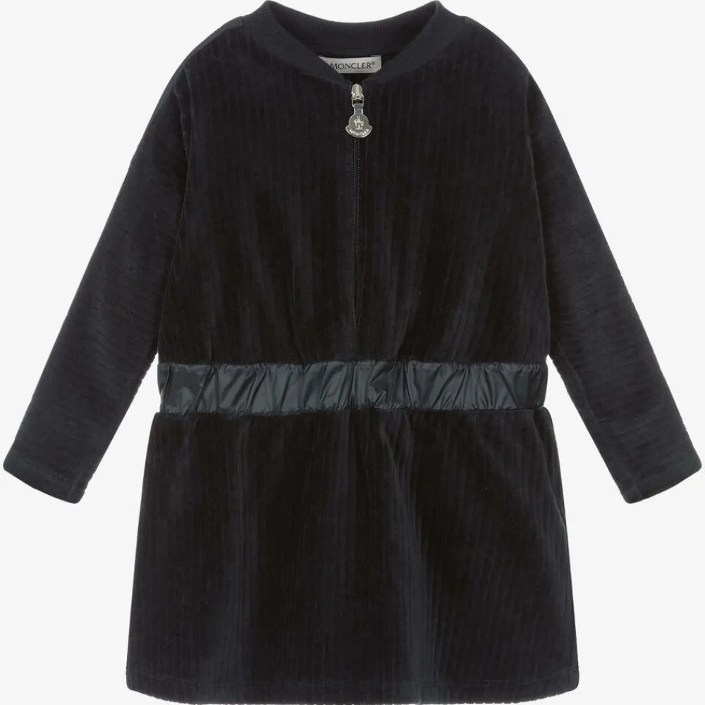 Sweet navy blue dress for little girls by luxury brand Moncler Enfant, made in soft and lightweight cotton corduroy. In a classic silhouette, with a modern upgrade, it has silky trims and a half-zip fastening with a bomber-style collar. The brand's iconic logo badge can be found on one sleeve, with a matching branded zip on the front.