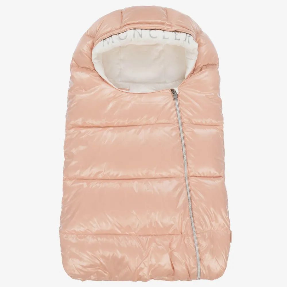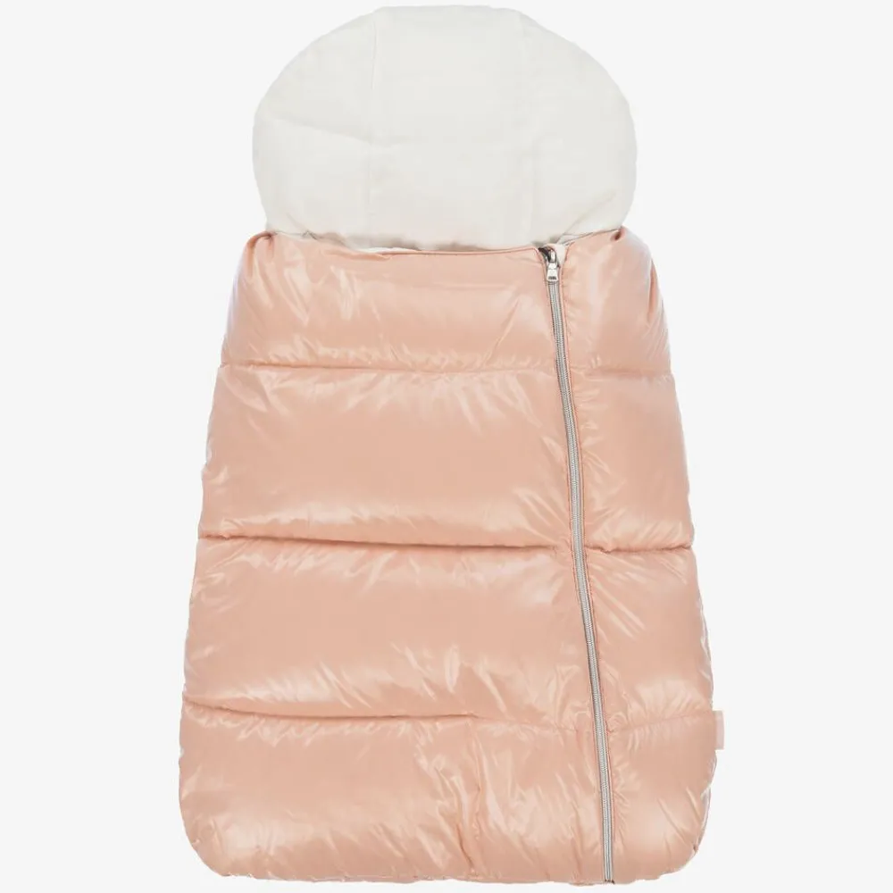 Pink hooded nest for baby girls by luxury brand Moncler Enfant. Made in smooth and shiny fabric, it is lined in soft white cotton jersey for comfort, and has warm and cosy down padding. The hood has a white trim around the front with a silver logo print and it fastens with a zip down the front. There are openings on the back, allowing the nest to be used safely in a pram.