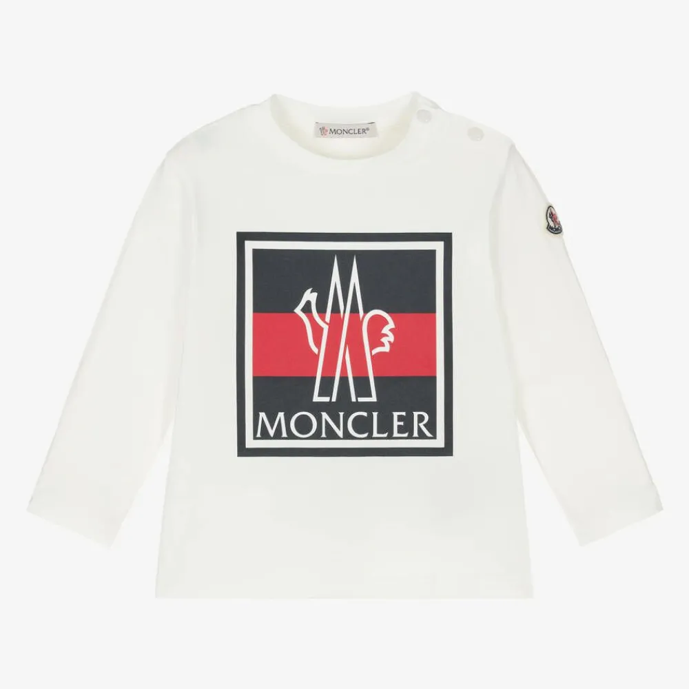 Moncler Enfant Tops*Boys Ivory Cotton Tricolour Logo Top