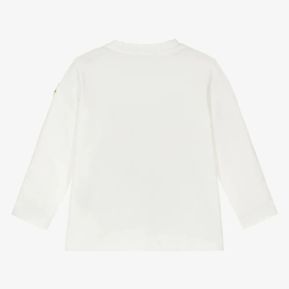 Ivory cotton top for little boys by luxury brand Moncler Enfant. The iconic felted logo patch is stitched on one sleeve, and the signature motif is printed on the front in a bold tricolour design. It is made in soft and stretchy jersey with shoulder popper fastenings to help with over-the-head dressing.