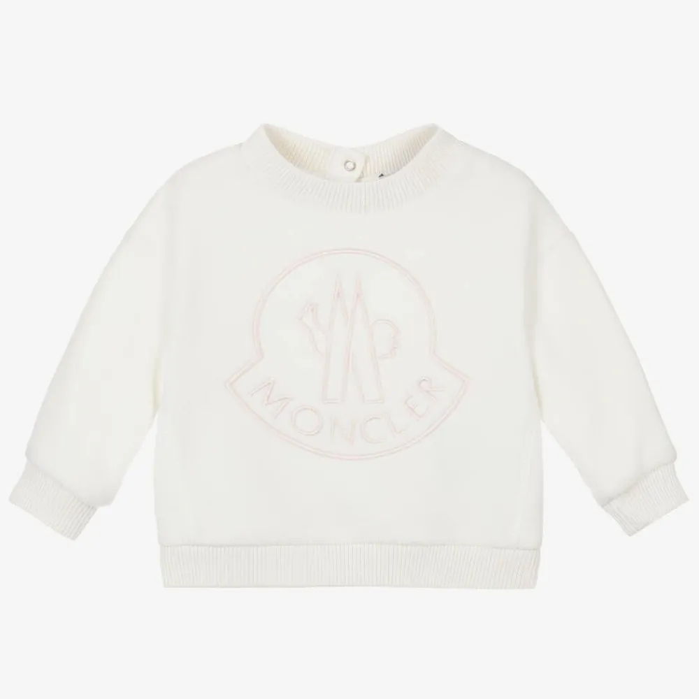 Stylish ivory sweatshirt for little girls from luxury brand Moncler Enfant, made in super soft and cosy fleece. The designer's iconic logo is embroidered on the front in pink and there is a signature felt logo patch on one sleeve. It has casual ribbed trims and there are useful popper fastenings on the back.