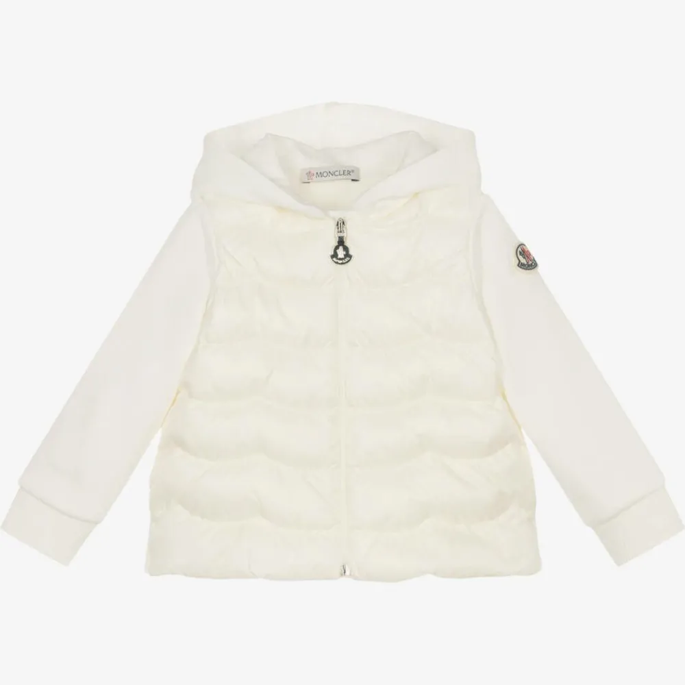 Cosy and comfortable for little girls, this ivory hooded zip-up top is by luxury French brand Moncler Enfant. Made in soft cotton jersey, it has a silky nylon front, padded with soft down for extra lightweight warmth. The designer's iconic felt logo is appliquéd on the chest and the logo-embossed zip puller adds a statement finish.