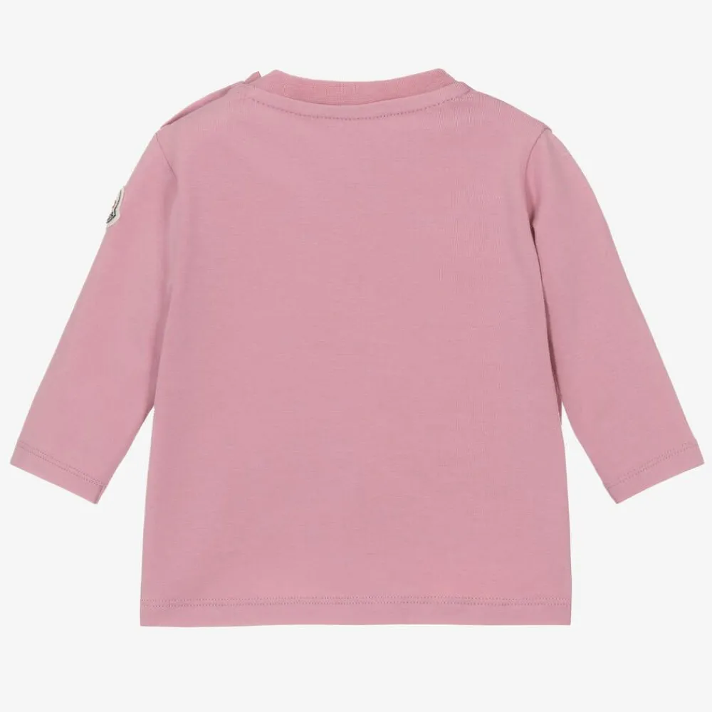Long-sleeved top for little girls from luxury brand Moncler Enfant, in a lovely lilac pink shade. Made in soft and comfortable cotton jersey, it has a casual crew neck and easy popper fastenings on one shoulder. It is printed on the front with the designer's iconic logo in purple, pink and blue and has a felt logo patch on one sleeve for a signature finish.
