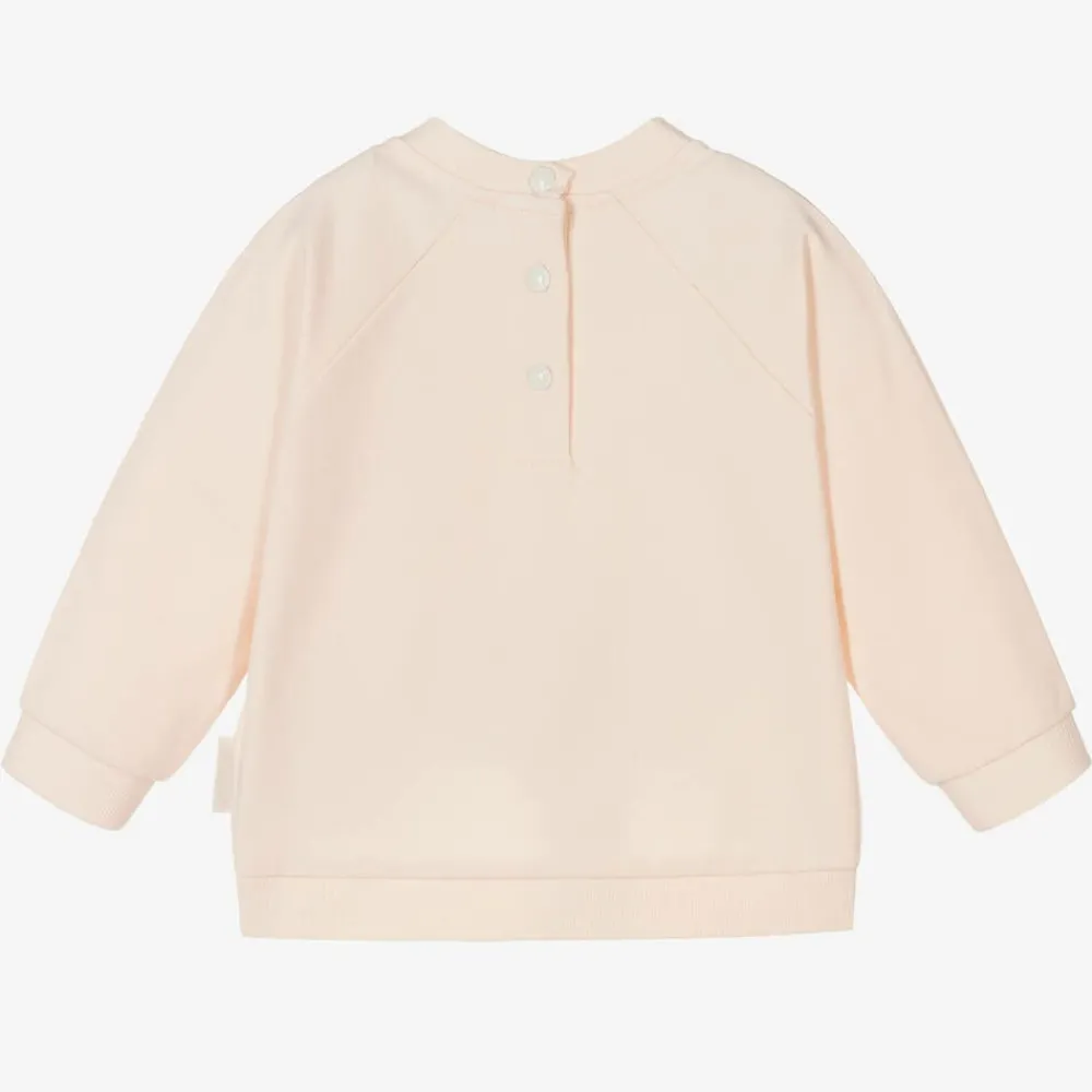 Younger girls pale pink sweatshirt by Moncler Enfant. The designer's logo is printed across the front in white painted lettering. The soft cotton jersey fabric is mid-weight and there are ribbed trims and back popper fastening.