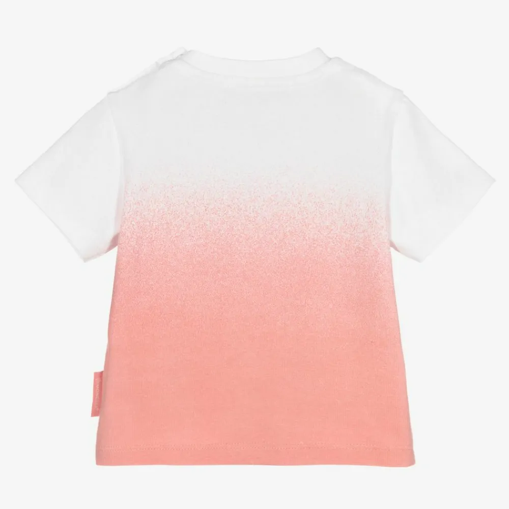 Cute and casual white and pink T-shirt for baby girls, by luxury French brand Moncler Enfant. Made in soft cotton jersey, it has the brand's signature logo printed on the front in white, and popper fastenings on one shoulder.