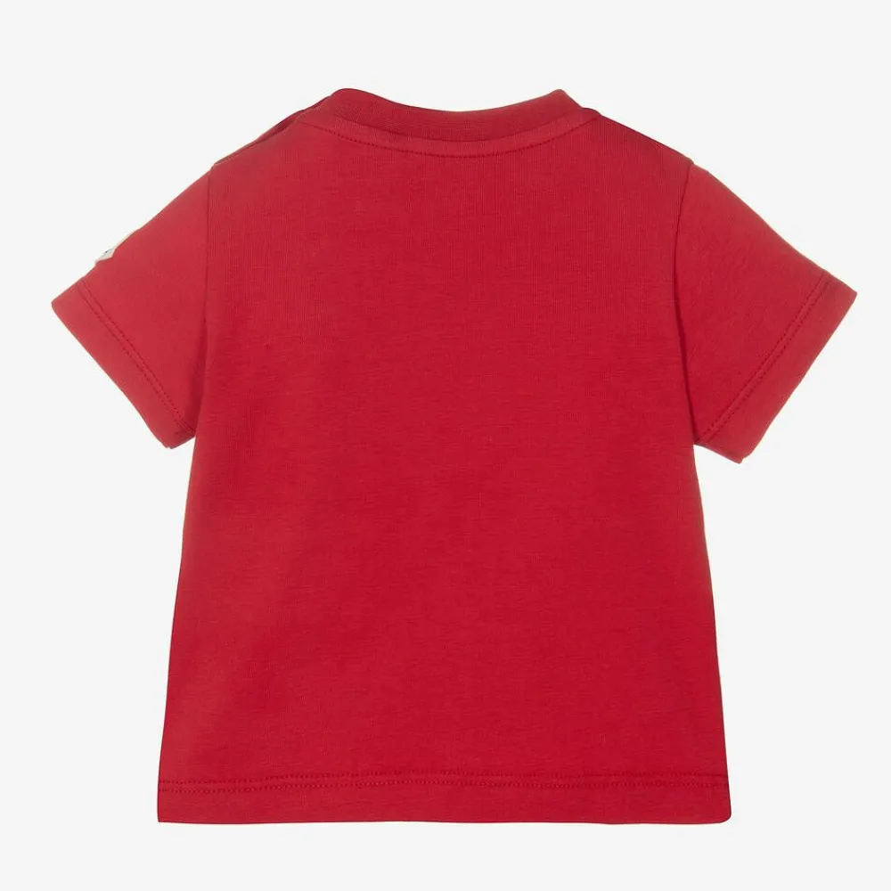 Adorable red cotton T-shirt for little boys and girls by luxury brand Moncler Enfant. It is made in soft and stretchy jersey with a gently ribbed crew neck and branded popper fastenings on the shoulder. It has an eye-catching white Moncler logo print on the front, with a cute brown mammoth character. The designer's iconic felt patch is stitched on one sleeve.