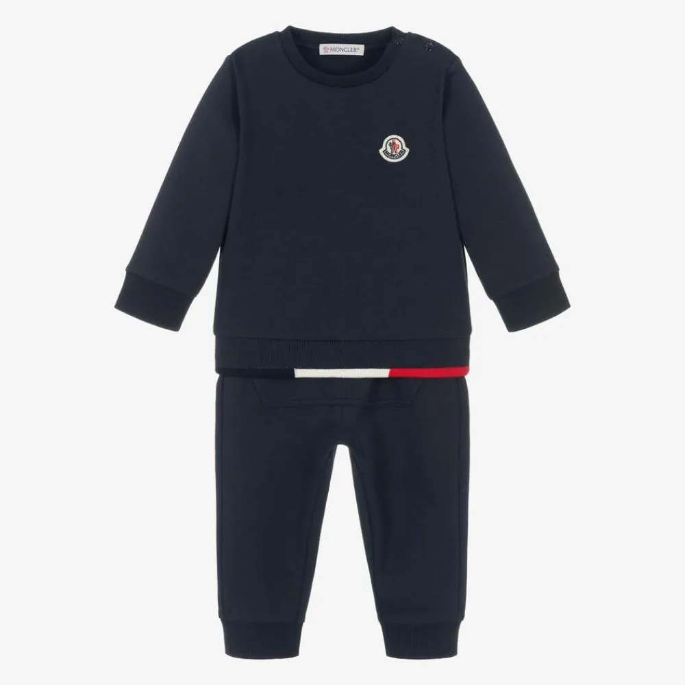 Cool and comfortable navy blue tracksuit for little boys by luxury brand Moncler Enfant, made in soft cotton jersey with ribbed trims. The sweatshirt has the iconic felt logo patch on the chest and the contrasting tricolour trim around the hem for a signature look. It fastens with branded poppers on one shoulder. The joggers have a gently elasticated waist, with a pouch pocket on the front.