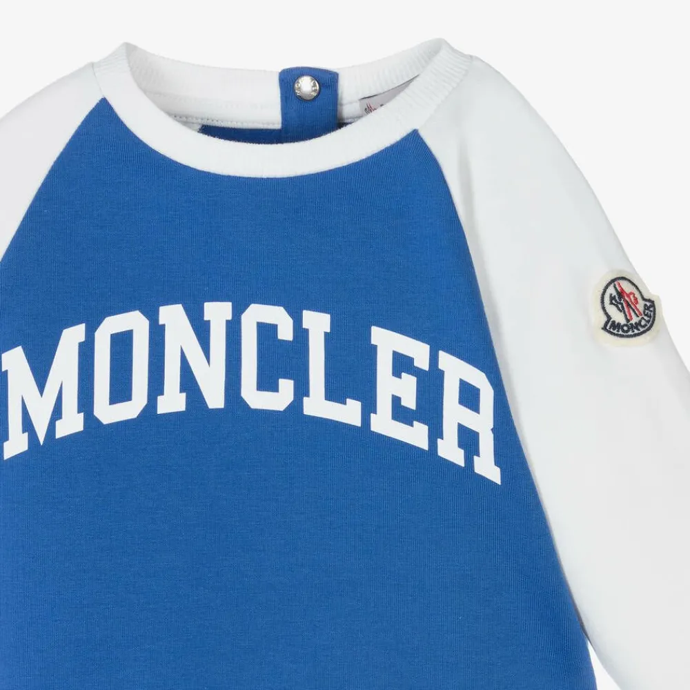 Cute blue and white tracksuit for little boys by luxury brand Moncler Enfant, made in soft cotton jersey, with a warm, fleecy inside. The top has a bold white logo print on the front and the brand's signature felted logo patch on one sleeve. There are ribbed trims and popper fastenings on the back to help make dressing easier. The matching joggers have a black logo print on a white panel on the front of the comfortable, elasticated waistband. There is a small logo tab on the back for a subtle designer finish.