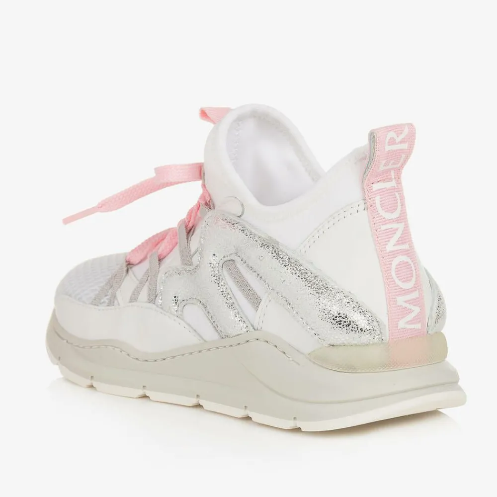 Girls white, pink and silver trainers by Moncler Enfant. They are made in neoprene with mesh over the toes, shiny silver and white leather trims and pink laces. The brand's logo is on the ankle in pink grosgrain tape. The grey outer sole is chunky and non-slip.