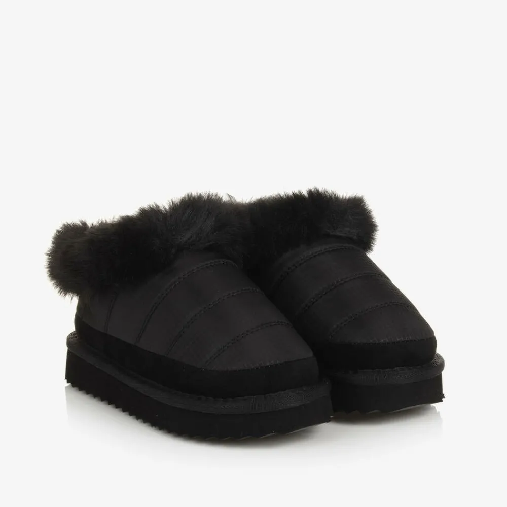 Casual and effortlessly stylish black slip-on ankle boots for girls by Monnalisa. They are made in lightly padded ripstop fabric with overstitching details and soft faux suede trims. The super soft faux fur full lining and trim at the low ankle cuffs give them a cosy cold-weather look. The platform rubber outsole is ridged for better grip.