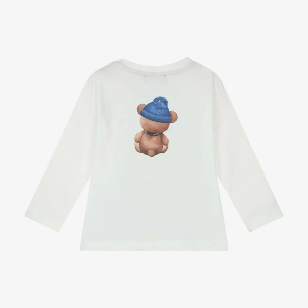 A long-sleeved cotton top for little boys by Italian brand Monnalisa. This ivory top has a cute bear print on the front and back, wearing a blue pom-pom hat and a checked scarf. It has a simple round neckline and red button fastenings on one shoulder.