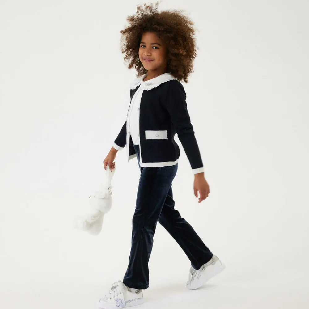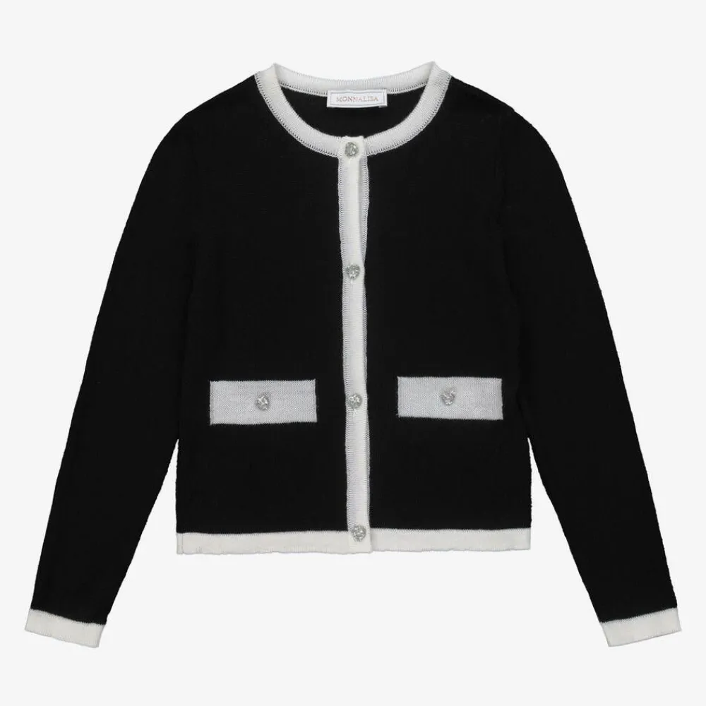 Chic black cardigan for girls by Monnalisa, luxuriously knitted in soft wool. Ideal as a sophisticated lightweight layer, it has an off-white trim and faux front pockets. There are sparkling crystal button fastenings on the front for added glamour and shine.