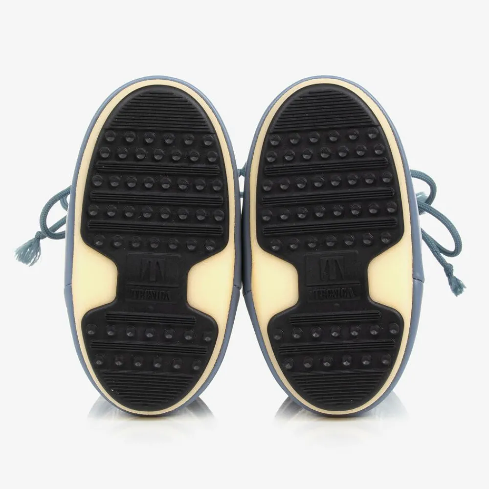 Stylish grey-blue long snow boots for boys and girls by Italian brand Moon Boot. Designed in the signature original style with bold white logo prints, they are heavily padded and ultra resistant, with faux leather trims and decorative laces. There is a drawstring tie on the cuffs ensuring a warm and comfortable fit and the thermoplastic non-slip rubber sole features tiny suction cups for improved grip on slippery surfaces. The technological foam lining will feel snug at first but will mould to the size and shape of the foot after a few hours of wear.