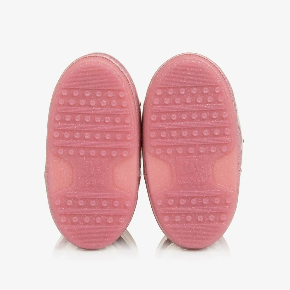 Glittery pink snow boots for girls by Moon Boot, inspired by the 1969 moon landing. Glossy, water-repellent and heavily padded for warmth, they have decorative tie-up laces. The thermoplastic rubber soles feature tiny suction cups for added grip on slippery surfaces. The technological foam lining will feel snug at first but will mould to the size and shape of the foot after a few hours of wear. Bold logo branding completes the statement après-ski look.