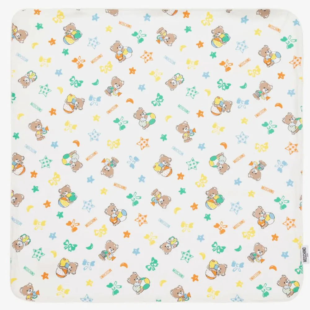 A charming ivory cotton blanket for baby boys and girls by Moschino Baby. One side is made from soft jersey and is patterned with a fun and colourful Moschino Teddy Bear logo print for a sweet look. The other side is made from a velvet-feel needlecord and is stitched with a tonal logo patch on one corner.