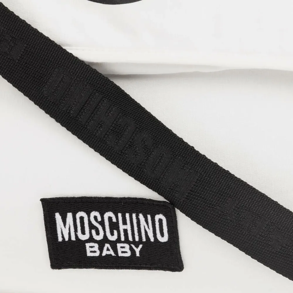 Ivory changing bag by Moschino Baby, printed with an iconic Moschino Teddy Bear logo on the front. Made from soft cotton jersey with a smooth lining and mid-weight padding, it has a black adjustable strap with branded jacquard detailing. The spacious main compartment has four useful pockets inside and comes with a matching logo-detailed changing mat. Fastening with a zip and velcro tab, this cool style has useful pockets on the sides and is finished with a black logo patch.