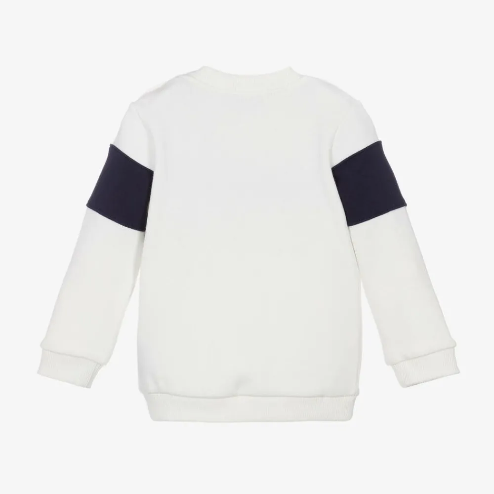 Ivory sweatshirt for little boys and girls by Moschino Baby. It features a navy blue logo panel for instant brand recognition, trimmed with appliquéd logo badges. Made in soft mid-weight cotton jersey, it has cosy ribbed trims and shoulder poppers to help with dressing.