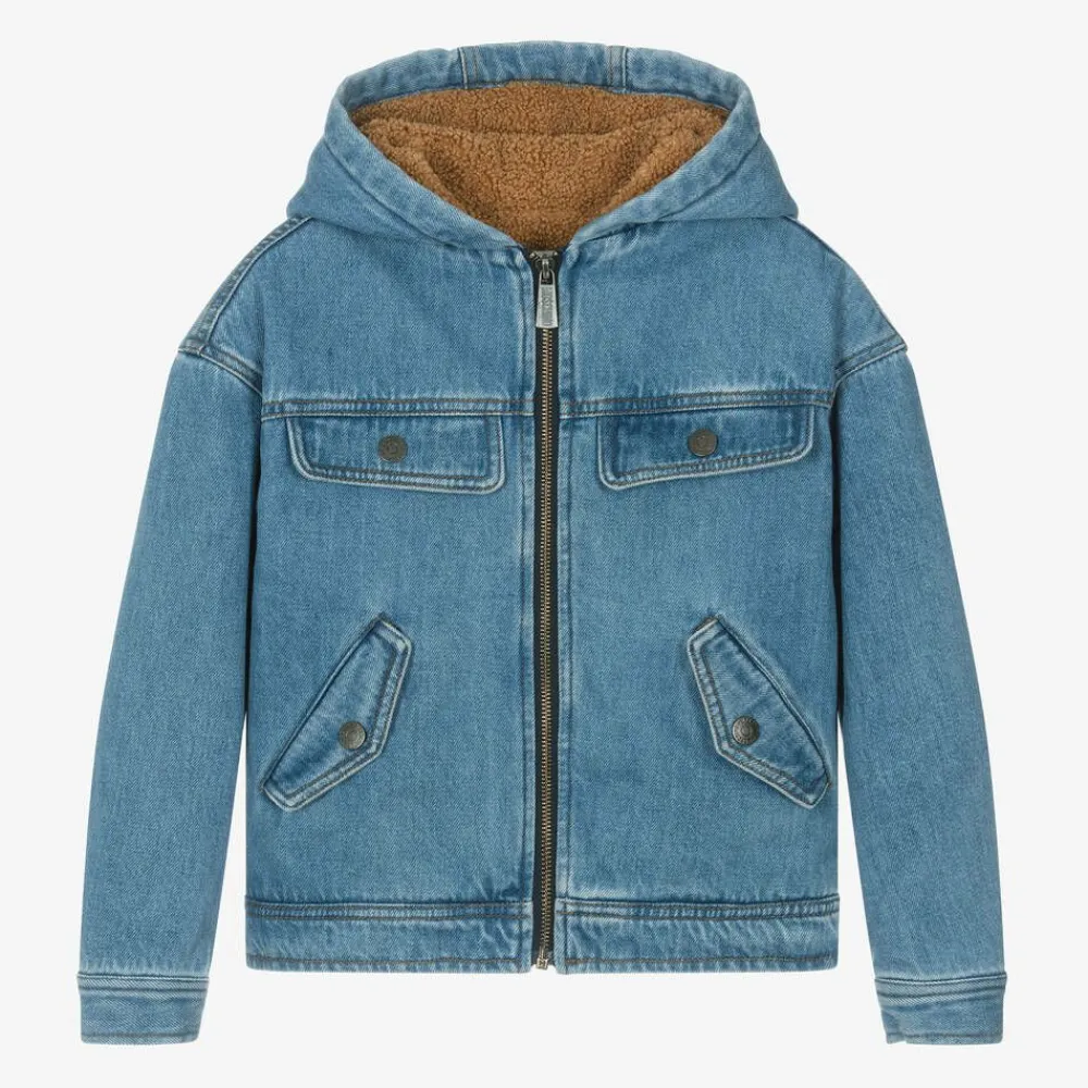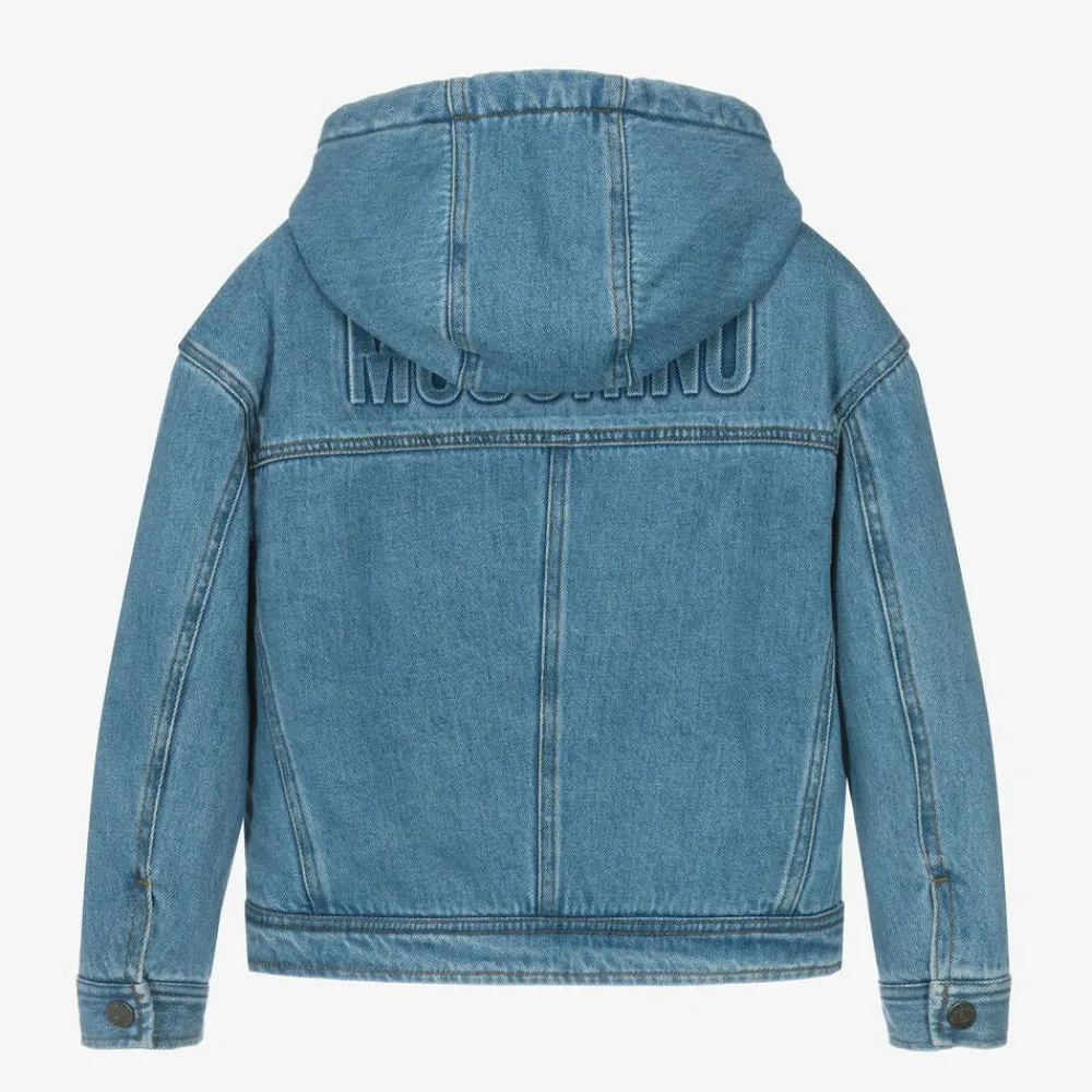 Blue denim jacket for boys by luxury Italian brand Moschino Kid-Teen, with a large, embossed logo on the back for instant brand recognition. The jacket has a washed and worn look, and is super cosy with a brown teddy fleece lining and hood. It has branded popper fastenings on the faux chest pockets a well as the hand pockets, with further branded detailing on the zip fastening.