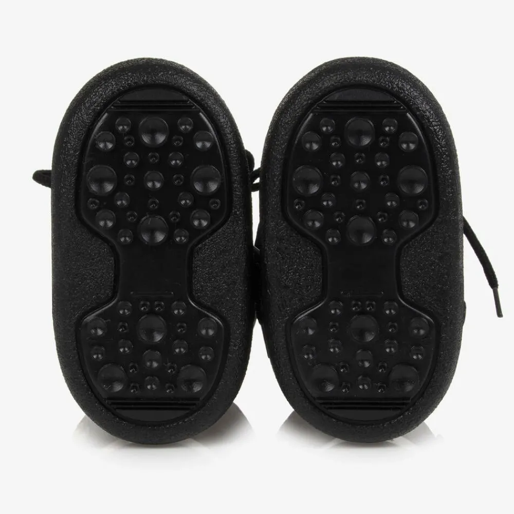 Black pull-on snow boots for boys and girls by Moschino Kid-Teen. The Moschino Teddy Bear rubberised patch can be found on the side with logo patch embroidery beneath. The calf-length textile shaft can be fastened with the drawstring to keep feet dry, warm and cosy. They are lined with super soft and snuggly fleece for added warmth. The rubber soles have textured treads to improve grip on slippery and wet surfaces.