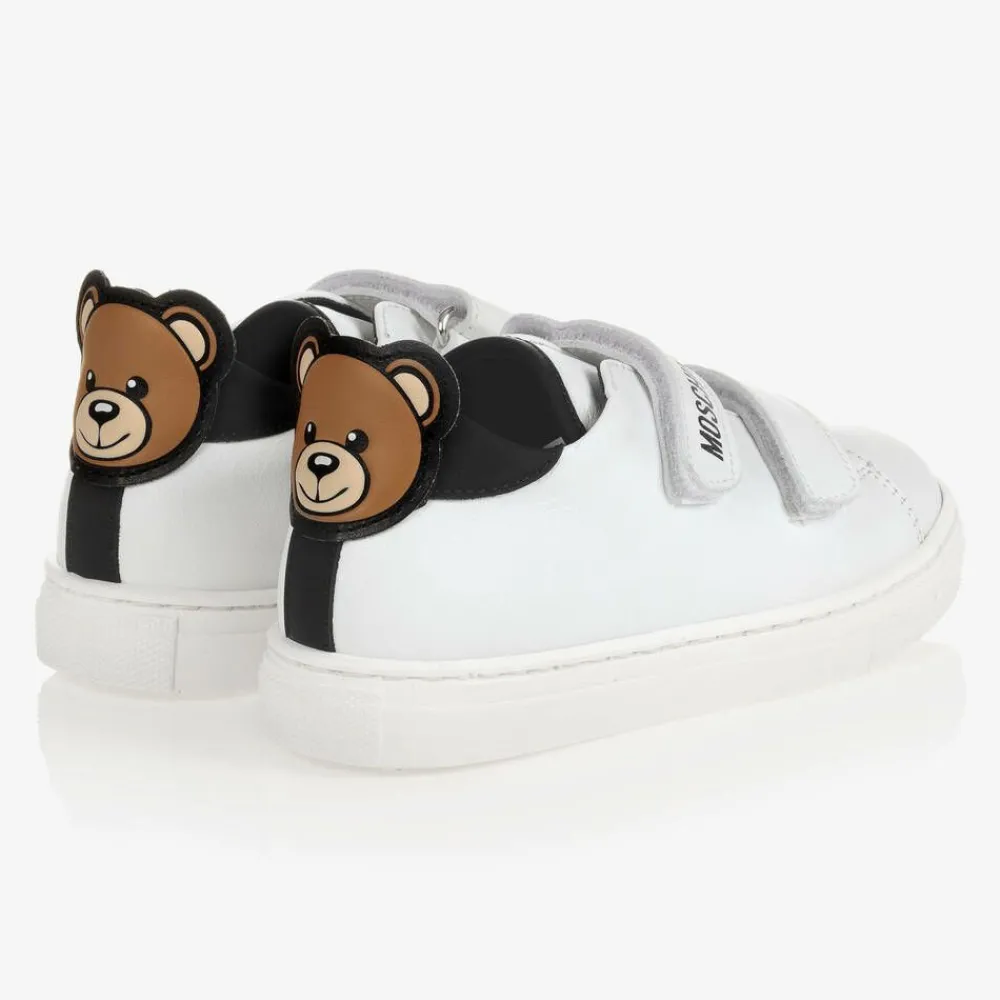 White leather trainers for boys and girls by Moschino Kid-Teen, detailed with a Moschino Teddy Bear appliqué on the heel. Velcro fastening, they have contrasting panels of black and a black printed logo. They are fully lined in leather, with a leather inner sole and feature a white non-slip rubber outer sole.
