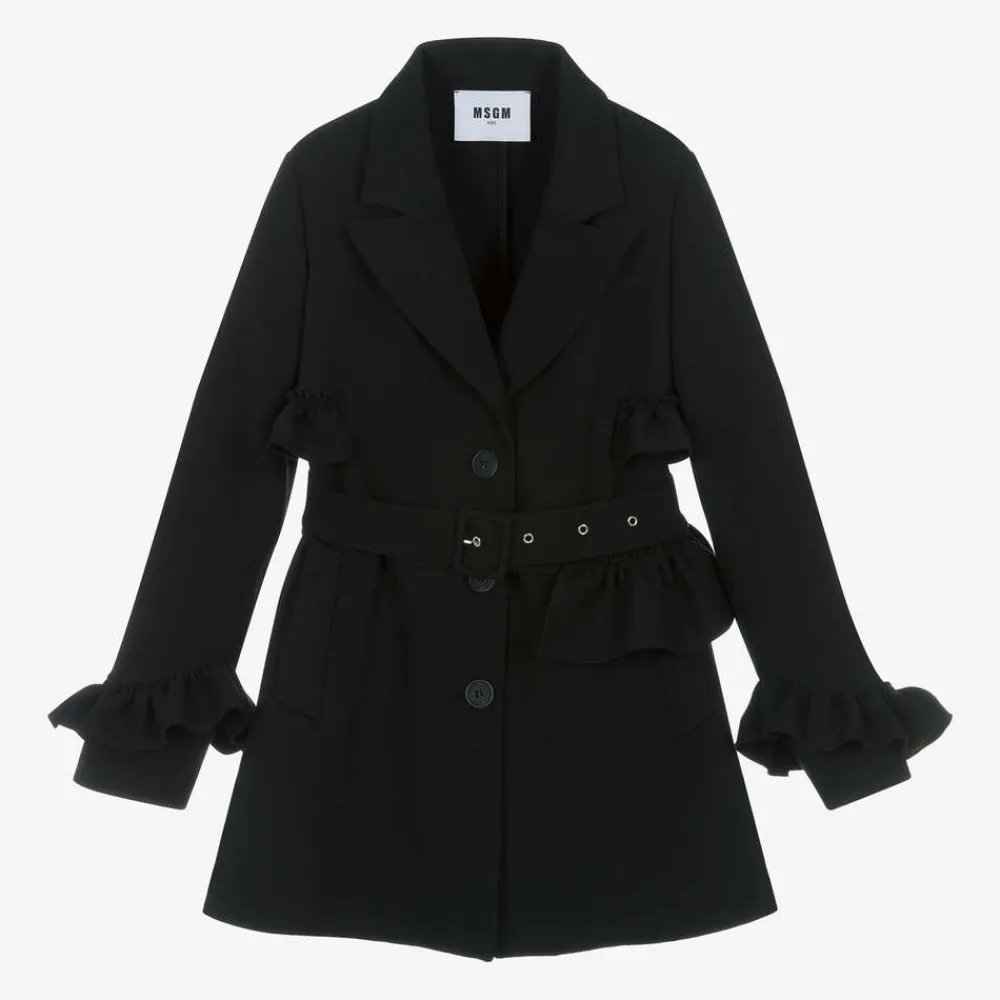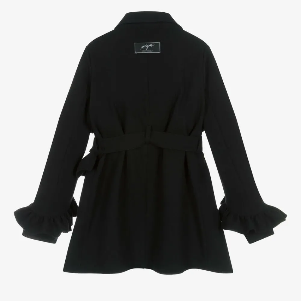 Black coat for girls by Italian brand MSGM, made in a soft, mid-weight viscose blend. This stylish, smart coat has a notched collar and pretty frill trims on the cuffs and sides. There are front pockets and a removable buckle-fastening belt, which also has a frill. It fastens neatly on the front with branded buttons and, for a subtle designer finish, it has a black and white logo patch on the back.