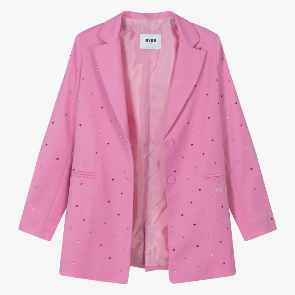 Eye-catching pink blazer for older girls by Italian brand MSGM. Sparkling with colourful rhinestones on the front and sleeves, it is ideal for a special occasion or to elevate a casual look. It is made in soft, viscose-blend twill, with useful front pockets, one embroidered with the designer's micro logo. The jacket fastens with fabric-covered buttons on the front and has a pink satin lining for comfort.