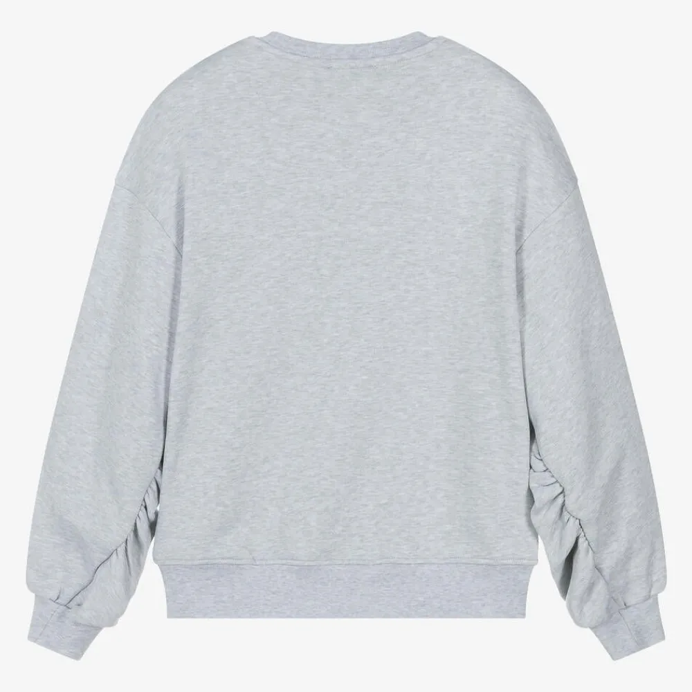 Grey marl sweatshirt for girls by MSGM, made in mid-weight cotton jersey with a fleecy inside. Easily layered over T-shirts, this long-sleeved top has ribbed trims and a relaxed fit. There is a kitten graphic on the front with a torn effect, positioned above the brand's MSGM brushstroke logo.