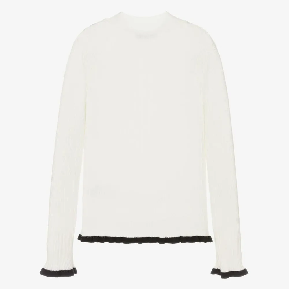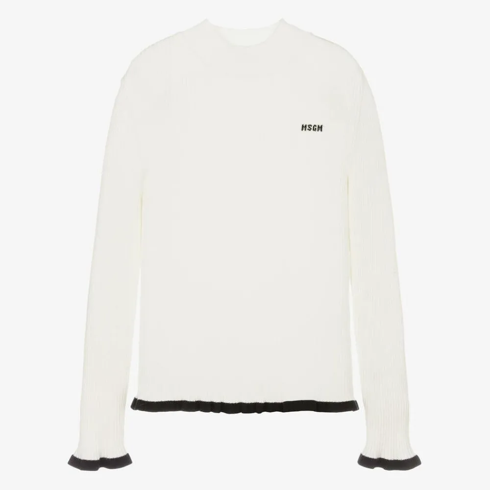 Ivory turtleneck sweater for girls by MSGM, knitted in a soft viscose blend. Stretchy and ribbed, it has an intarsia logo design on the front and black fluted trims on the sleeves and the hem.