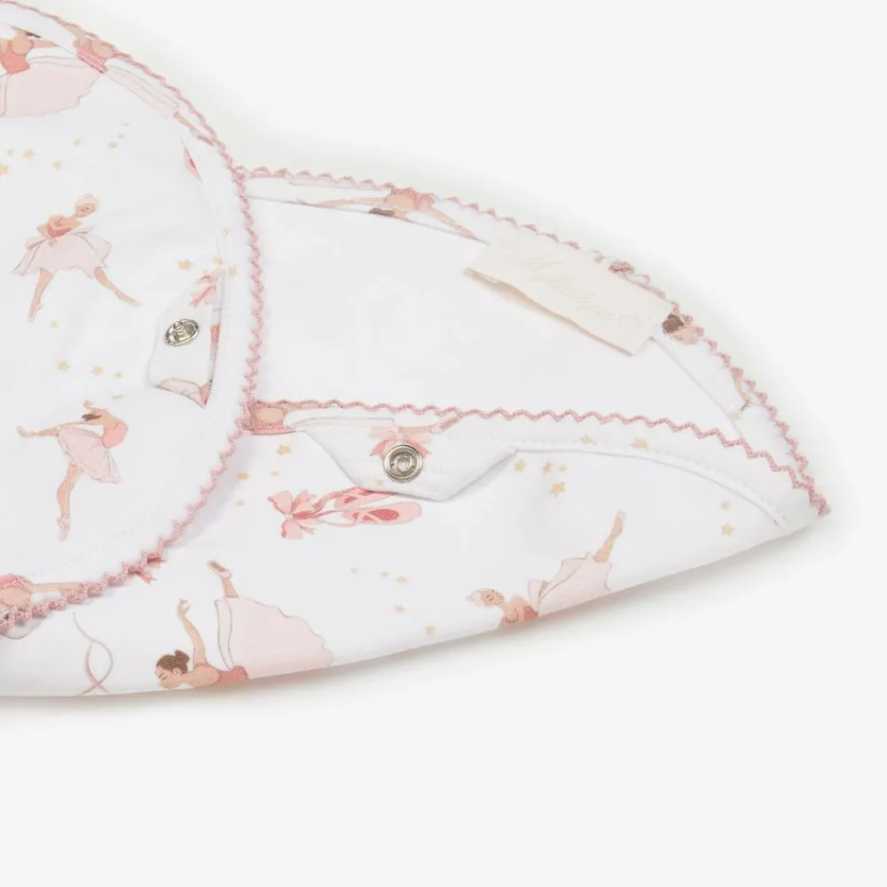 White burp cloth for baby girls from My Little Pie, patterned with a charming ballerina and swan design in pink. Made in super soft, organic Supima cotton jersey, this generous sized feeding accessory has a unique shape making it ideal as a burping cloth. It can also be used as an absorbent bib, securing easily with a popper.