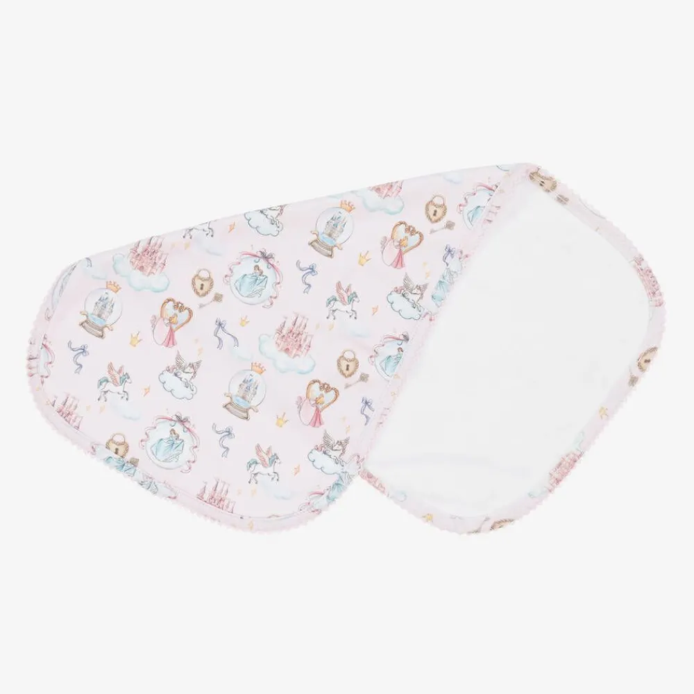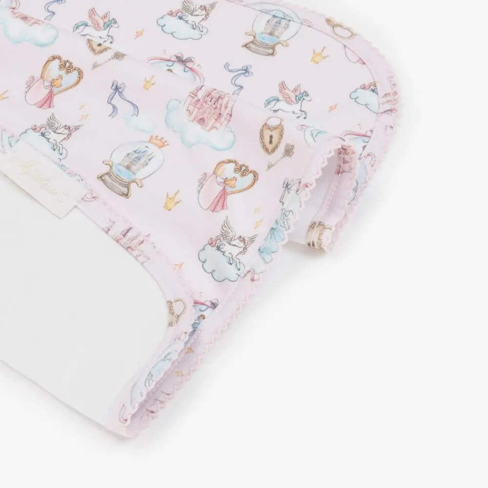 Pale pink muslin for baby girls by My Little Pie, with a charming fairy tale princess and castle print. Made in super soft organic Supima cotton jersey and edged in delicate picot embroidery, it is ideal for use as a burping cloth or nursing cover.