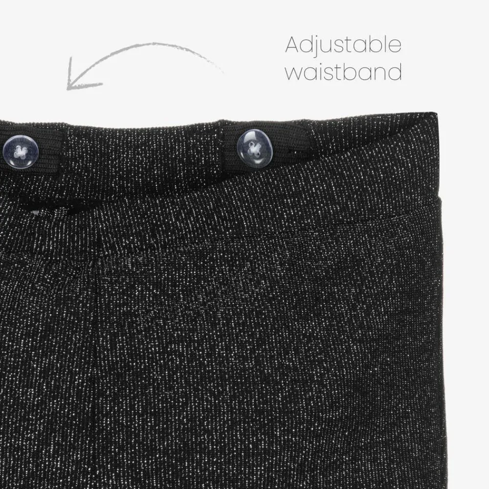 Stylish black flared trousers for girls by Name It. Great for a party look, they are made from a smooth and stretchy fabric that is woven with silver metallic threads for a shimmery finish. Easy to pull on, they have an adjustable waist to ensure a comfortable fit.