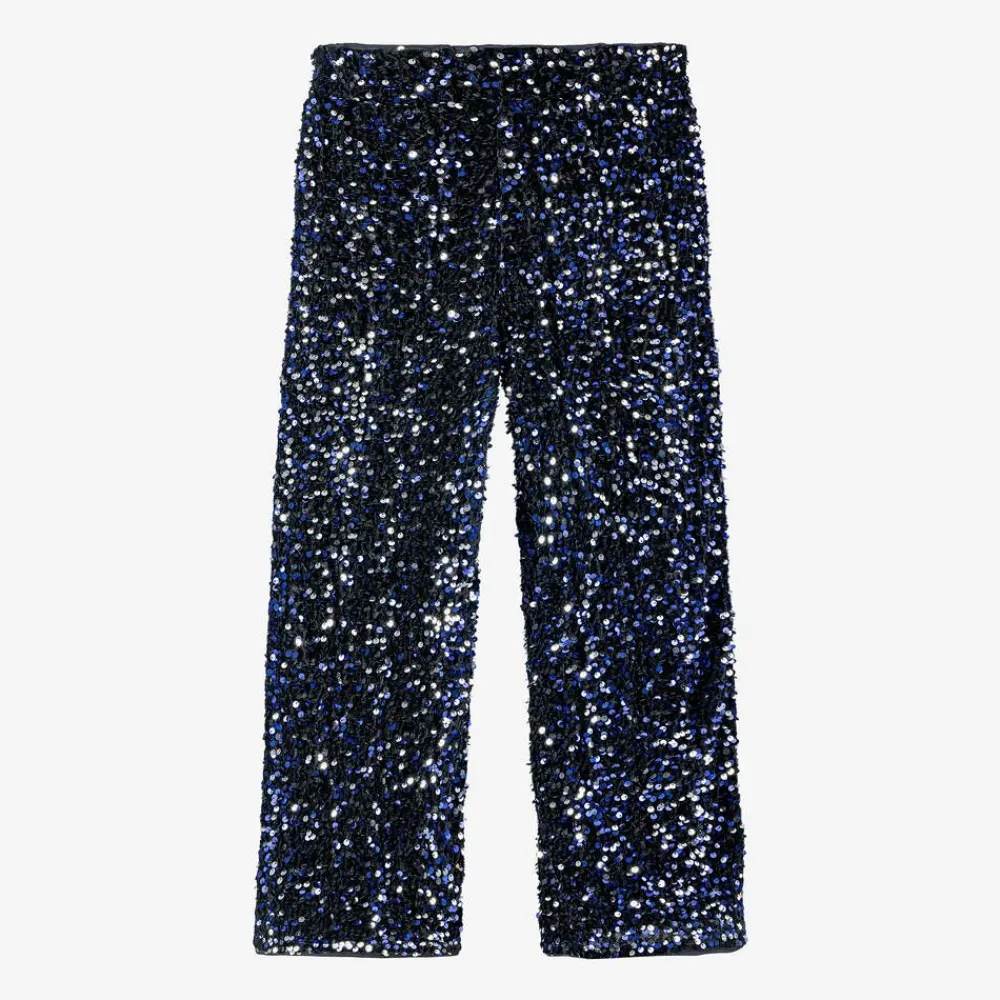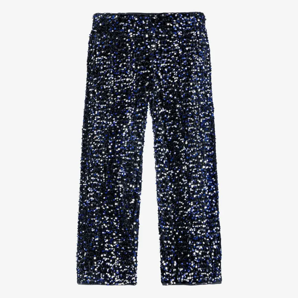 Super sparkly, black velour Name It trousers for girls, covered in shiny silver and blue sequins. Stylish yet comfortable for a glamorous party look, this flared style has a stretchy waistband with adjustable elastic for an ideal fit. A soft and stretchy jersey lining adds a gentle feel against the skin.