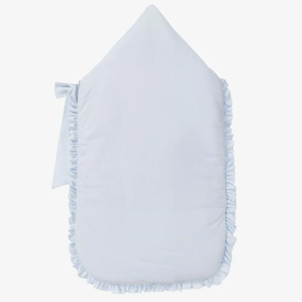 A light blue baby nest for boys and girls by Nanán, made in soft cotton jersey with lightweight padding. Warm and cosy, it has an easy zip fastening down one side and across the bottom. There are popper fastenings on the hood, which can be opened and laid flat like a pillow. It has a decorative ruffled trim around the edge, as well as a fixed bow and a sweet teddy bear appliqué on the front. The tonal embroidery reads 'Sleep… sleep little angel' in Italian, along with the brand's name seen in one corner.