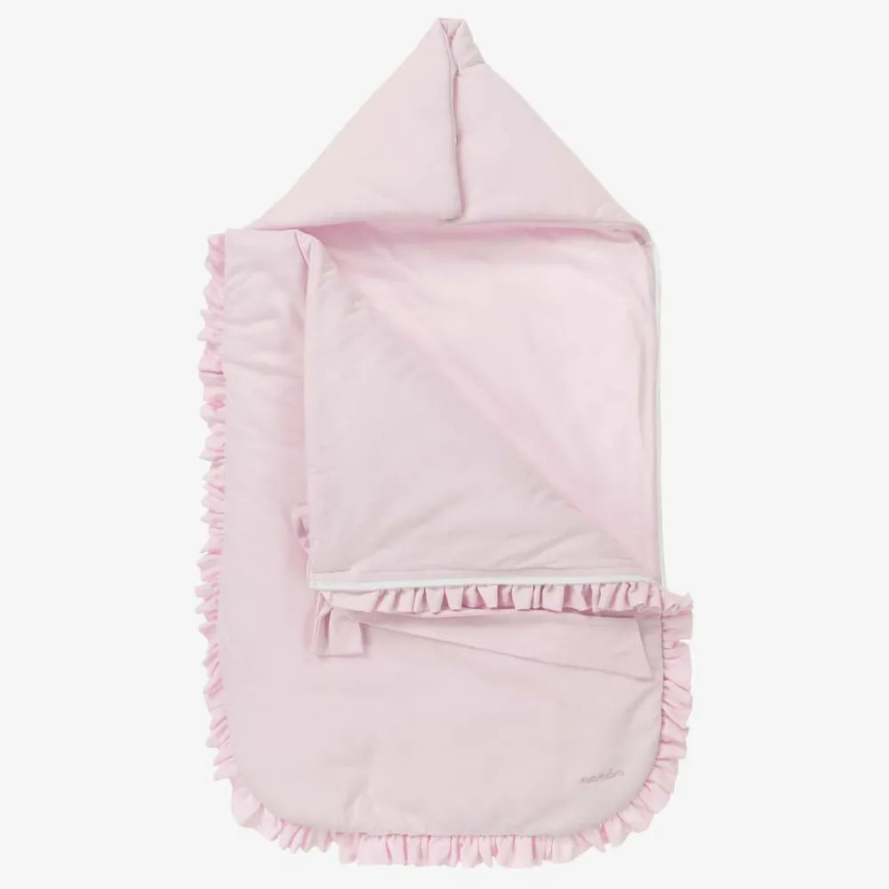 A light pink baby nest for girls by Nanán, made in soft cotton jersey with lightweight padding. Warm and cosy, it has an easy zip fastening down one side and across the bottom. There are popper fastenings on the hood, which can be opened and laid flat like a pillow. It has a decorative ruffled trim around the edge, as well as a fixed bow and a sweet teddy bear appliqué on the front. The tonal embroidery reads 'Sleep… sleep little angel' in Italian, along with the brand's name seen in one corner.